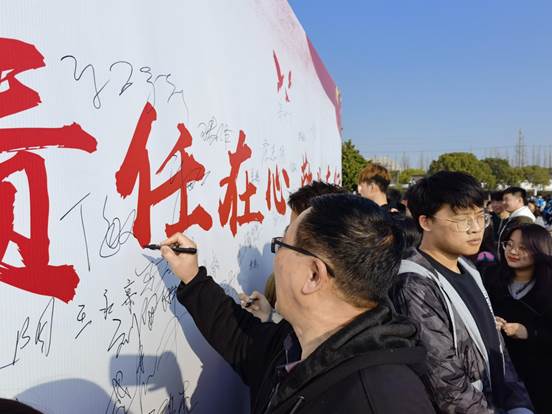 升旗仪式后,在场师生代表在主题教育签名墙上签名。同学们纷纷表示,在接下来的学习生活中必将严格要求自己,努力提升自身素养,真正做到责任在心,敬业于行。