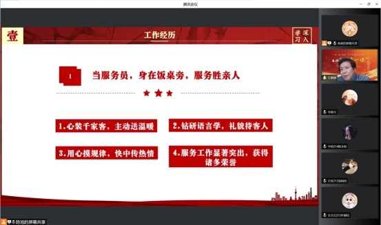王健康以“干一行、爱一行、专一行、精一行”为主题,从“当服务员,身在饭桌旁,服务胜亲人”“当经理人,改善服务质量,提升工作效益”两个部分展开,与师生们分享了自己的成长经历,诠释伟大的劳动精神与劳模精神。